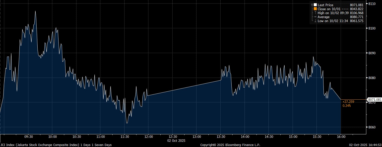 Pada Kamis (2/10/2025), IHSG ditutup di posisi 8.071,08. Menguat 0,34% dibanding hari sebelumnya.