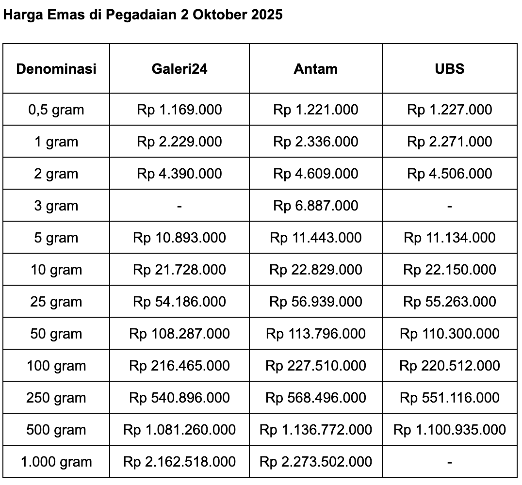 Adapun untuk ukuran 1 gram, harga emas Galeri 24 di Pegadaian adalah Rp 2.229.000. Lebih sedikit Rp 13.000 dibandingkan kemarin.
