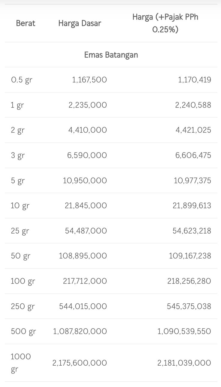 Berikut daftar harga emas Logam Mulia Antam selengkapnya untuk hari ini: