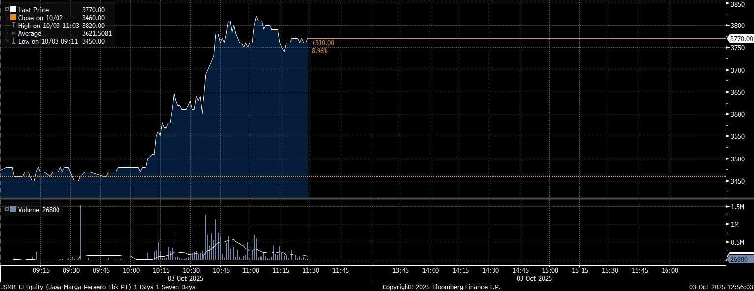 Saham JSMR berhasil menguat 310 poin atau mencapai kenaikan 8,96% ke level Rp3.770/saham usai sebanyak 21 juta saham ditransaksikan. Adapun nilai transaksi saham JSMR siang hari ini mencapai Rp78,98 miliar.