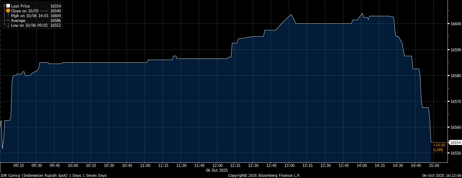 Pada Senin (6/10/2025), US$ 1 diperdagangkan Rp 16.554 pada penutupan pasar spot. Rupiah terdepresiasi 0,08% dibanding hari sebelumnya.