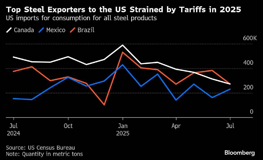 Meski tarif dasar baja setinggi 50%, negara-negara sebenarnya menerapkan tarif efektif yang lebih rendah. Besi dan baja pada Juli, tarif efektifnya di bawah 30% untuk Kanada, Meksiko, dan Brasil, menurut data yang dikumpulkan Bloomberg, yang dihitung termasuk pengecualian yang dinegosiasikan.