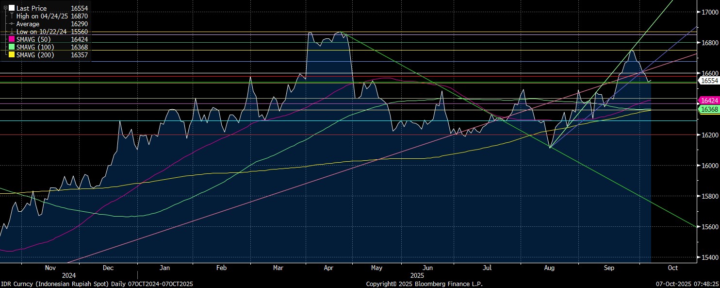 Pada Senin (6/10/2025), US$ 1 setara dengan Rp 16.554 pada penutupan pasar spot. Rupiah melemah tipis 0,08% dibanding hari sebelumnya.