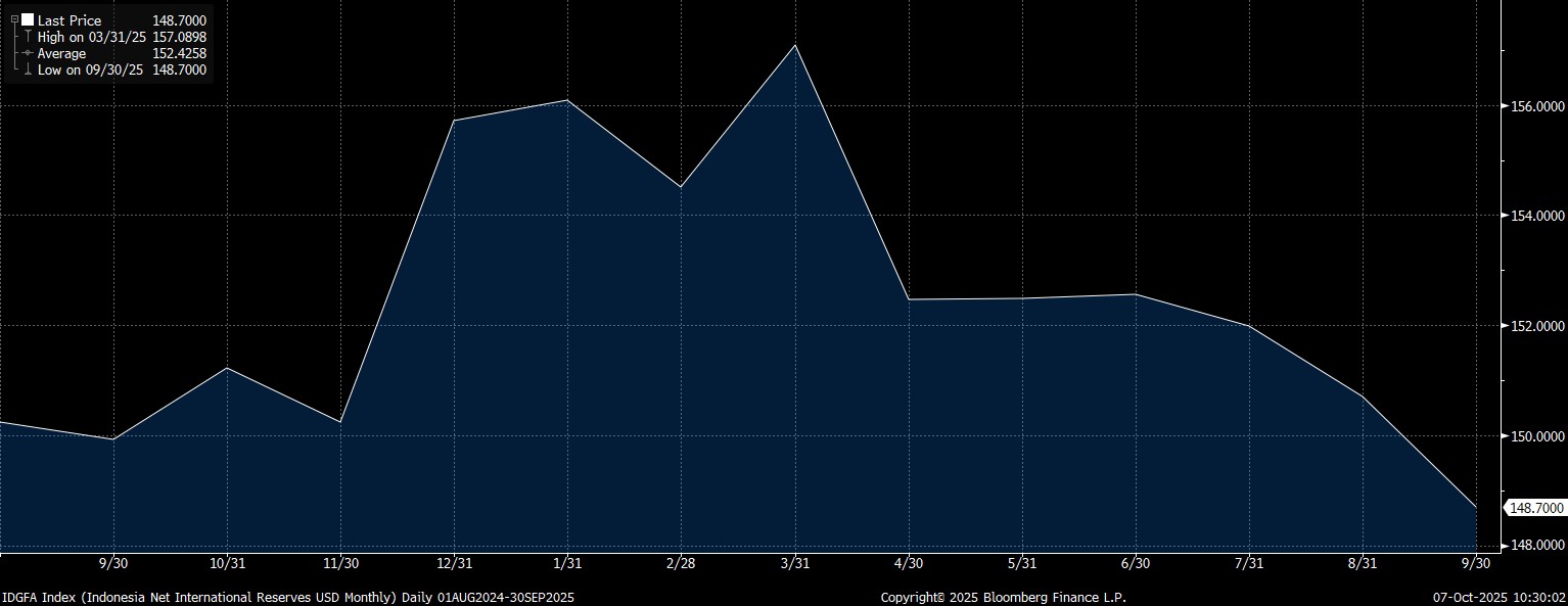 Posisi cadangan devisa per September terbilang US$ 148,7 miliar, tergerus hingga US$ 2 miliar dibanding posisi bulan sebelumnya. Level tersebut menjadi posisi cadev RI terendah sejak Juli 2024 tahun lalu.