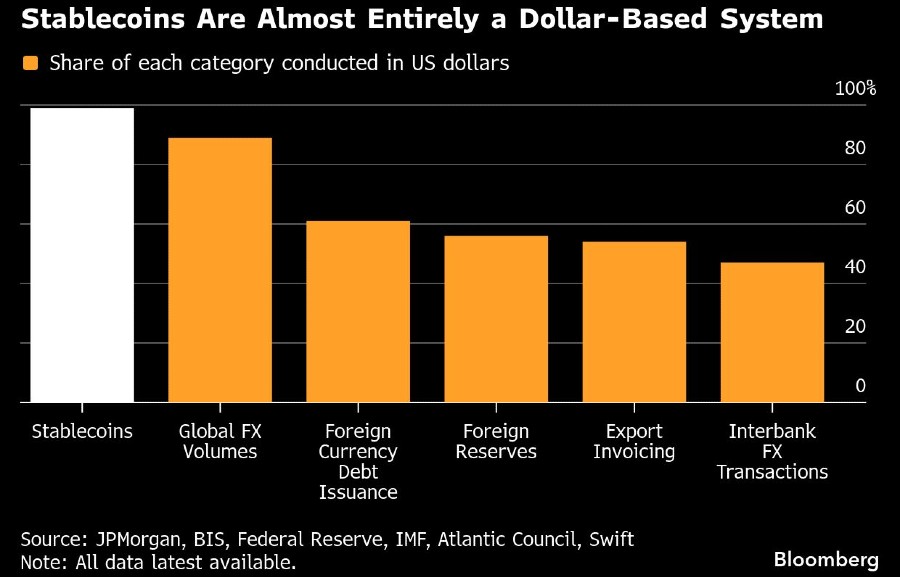 “Stablecoin saat ini lebih didominasi oleh dolar AS dibandingkan sistem keuangan global lainnya seperti cadangan devisa dan penagihan perdagangan,” tulis Padh, Chandan, dan Popescu.