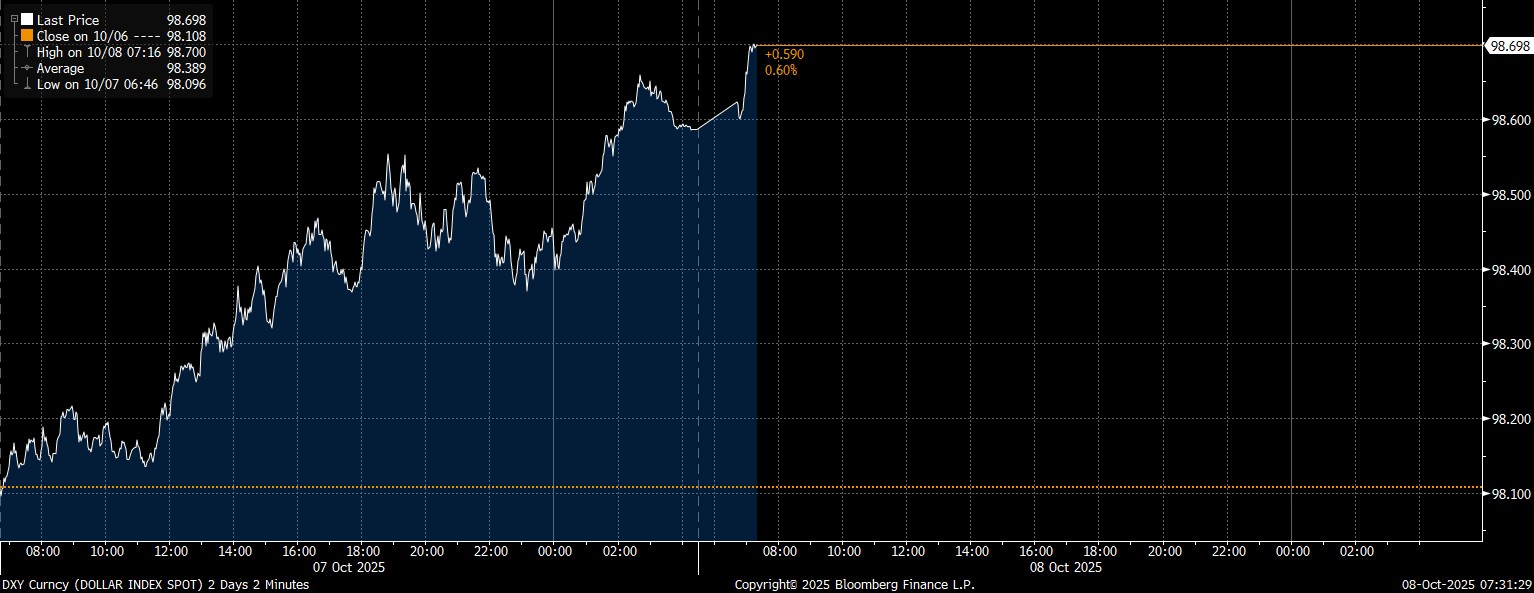 Pagi hari ini, Dollar Index lanjut menguat mencapai 0,48% mencapai 98,698.