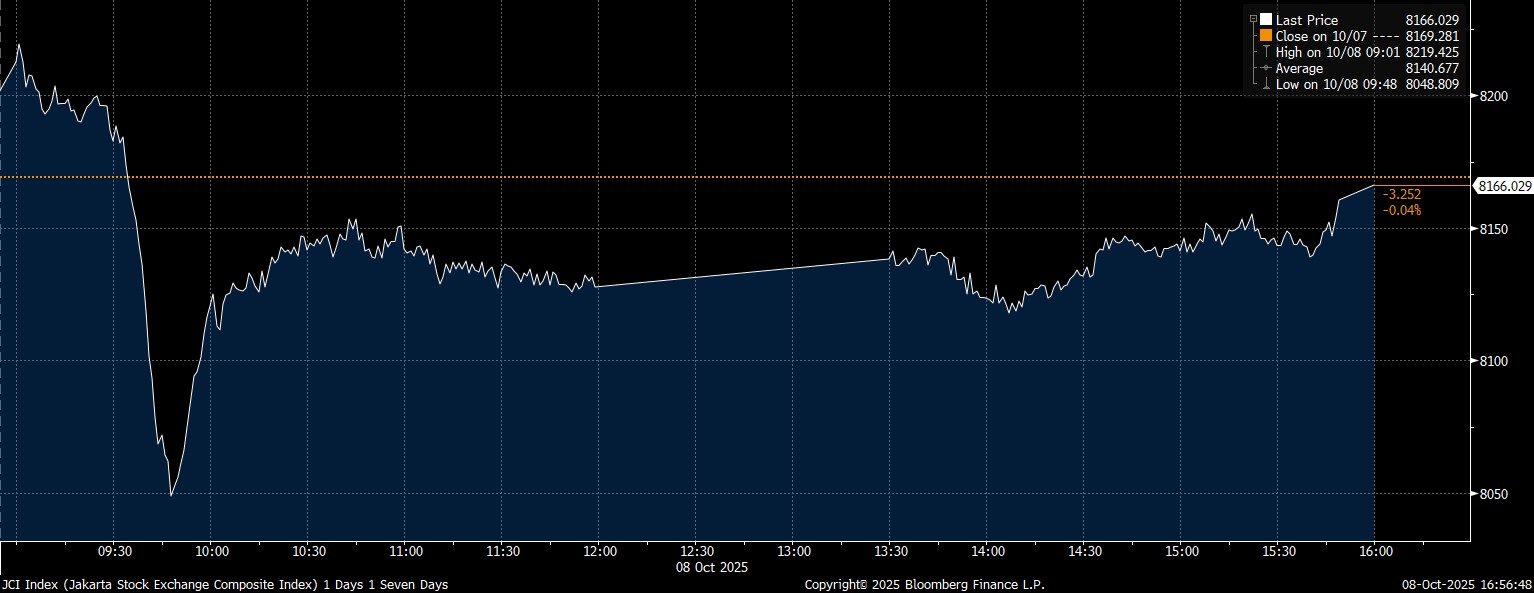 Bloomberg Technoz, Jakarta - Indeks Harga Saham Gabungan (IHSG) ditutup di zona merah, melemah 0,04% di 8.166,02 pada Rabu (8/10/2025). Sejumlah saham LQ45 berikut ini justru berhasil melesat, saham Alamtri Minerals (ADMR) misalnya, melejit 24,8% ptp yang tersengat sentimen proyek smelter aluminium.