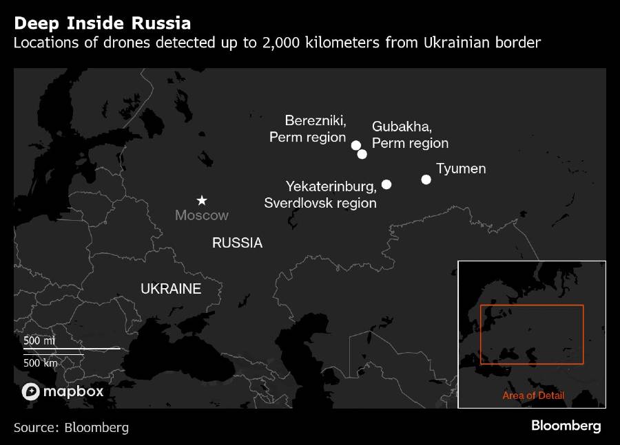 Drone terdeteksi di pusat-pusat industri di Pegunungan Ural dan wilayah kaya minyak Tyumen di Siberia.