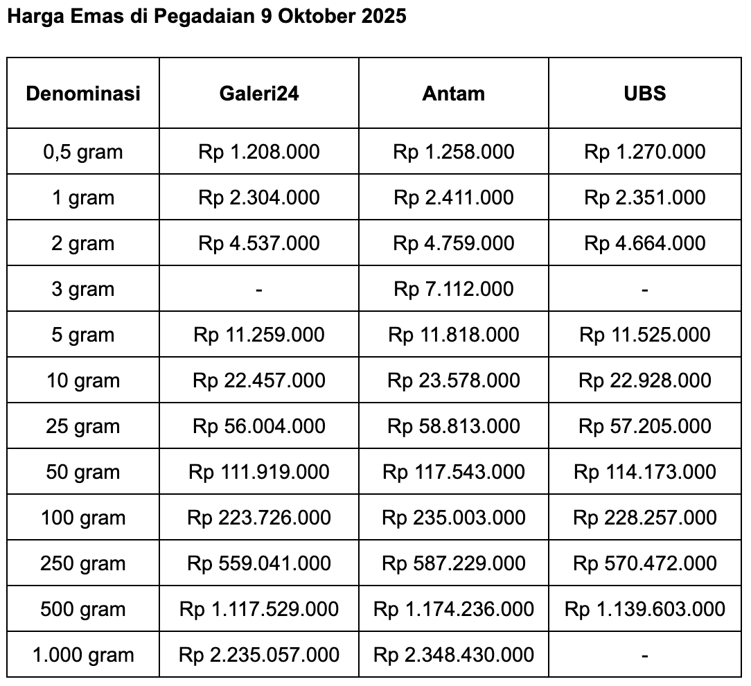 Lalu untuk emas batangan Galeri 24 ukuran 0,5 gram, Pegadaian menjual di harga Rp 1.208.000. Terdongkrak Rp 10.000 dibandingkan hari sebelumnya.