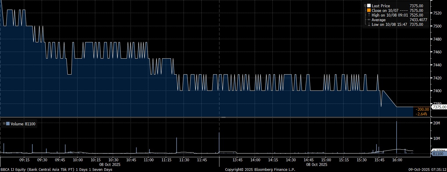 Adapun investor asing net sell yang masif pada saham PT Bank Central Asia Tbk (BBCA) mencapai Rp757,28 miliar. Tertekan tekanan jual, saham BBCA melemah 2,64% terpeleset di posisi Rp7.375/saham.