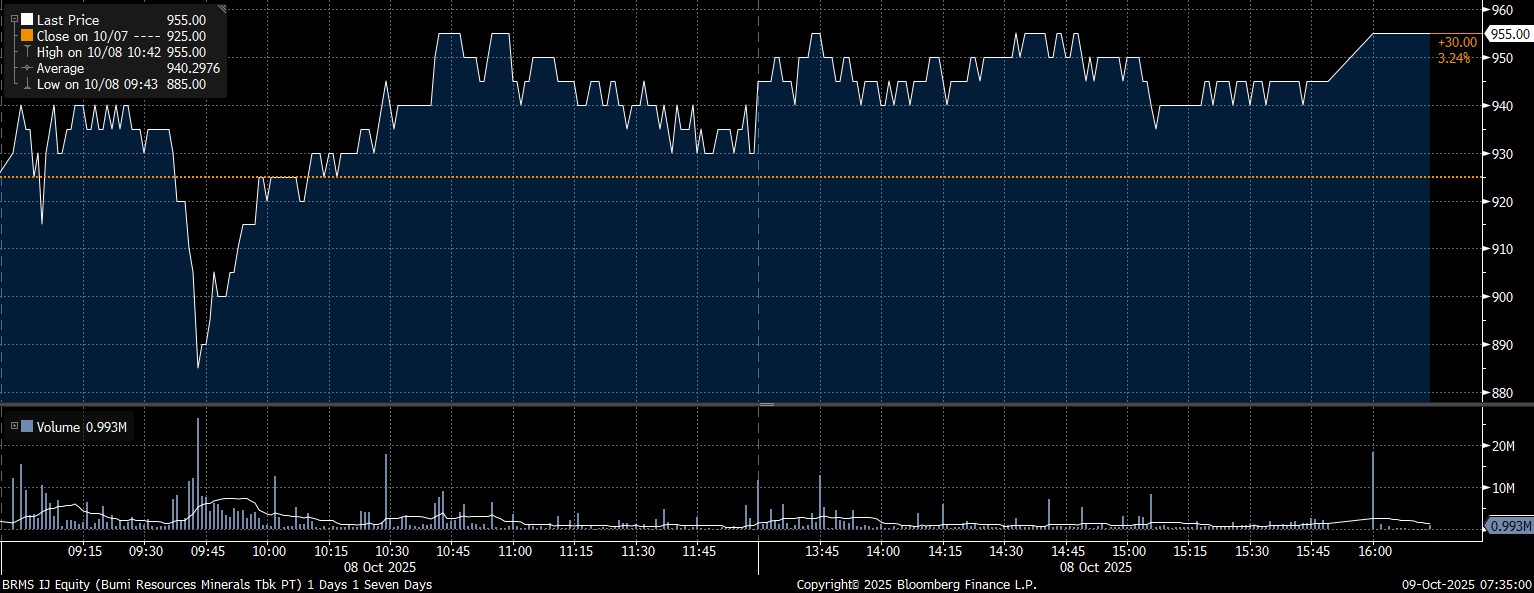 Sedang, investor asing mencatat net buy pada saham PT Bumi Resources Minerals Tbk (BRMS) mencapai Rp95,97 miliar. Didorong tren pembelian yang deras oleh asing, saham BRMS menguat 3,24% mencapai posisi Rp955/saham.