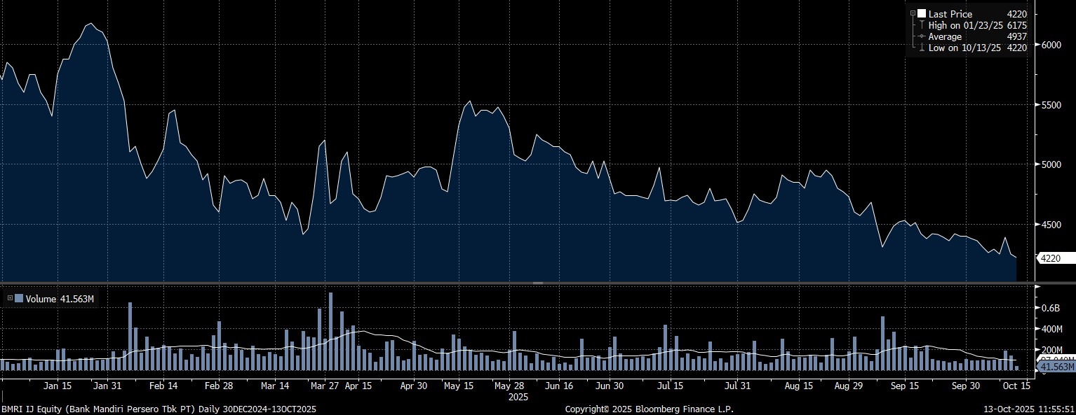 Sepanjang tahun ini (year–to–date), harga saham PT Bank Mandiri (Persero) Tbk (BMRI) sudah melemah 25,96% secara point–to–point, bersama dengan PT Bank Central Asia Tbk (BBCA) 24%. Sementara harga saham PT Bank Negara Indonesia (Persero) Tbk (BBNI) dan PT Bank Rakyat Indonesia (Persero) Tbk (BBRI) turun masing–masing 10,4% dan 10% dalam periode yang sama.