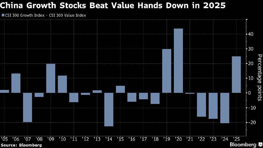 Indeks CSI 300 Growth telah mengungguli indeks value sebesar 25 poin persentase sepanjang tahun ini, menurut data yang dikumpulkan Bloomberg, siap mencatatkan kinerja tahunan terbaik dalam dua dekade.