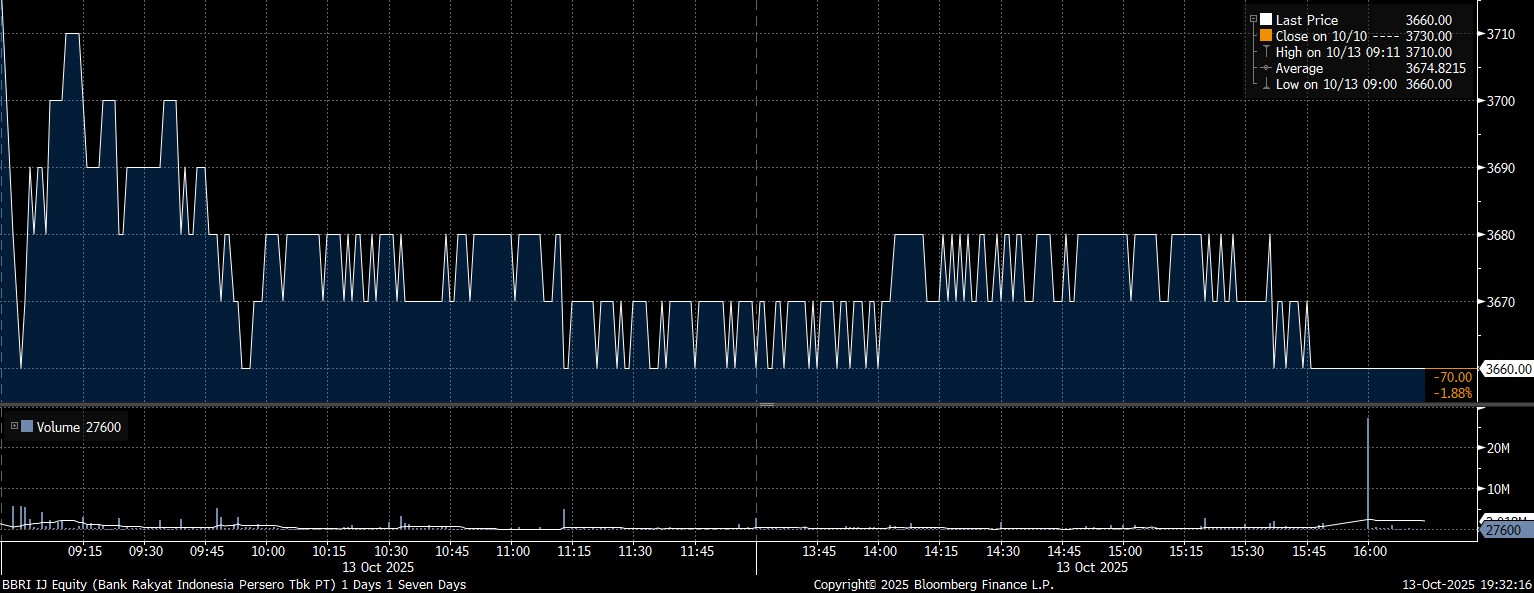 Sedang, investor asing net sell yang masif pada saham PT Bank Rakyat Indonesia Tbk (BBRI) mencapai Rp265,22 miliar. Imbas tekanan jual, saham BBRI melemah 1,88% mencapai posisi Rp3.660/saham.