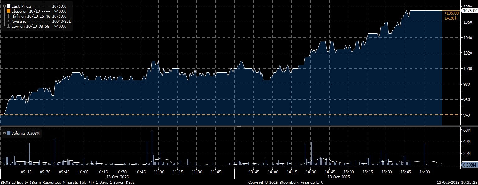 Bloomberg Technoz, Jakarta - Pada perdagangan saham kemarin, Senin 13 Oktober 2025, Indeks Harga Saham Gabungan (IHSG) ditutup di zona merah dengan pelemahan 0,37% ke 8.227. Diam–diam investor asing memborong saham BRMS hingga saham BREN.