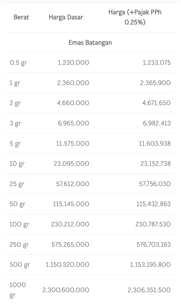 Berikut daftar harga emas Logam Mulia Antam selengkapnya untuk hari ini: