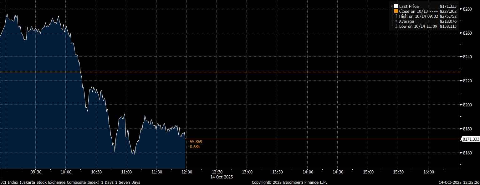 Bloomberg Technoz, Jakarta - Indeks Harga Saham Gabungan (IHSG) balik arah pada perdagangan Sesi I hingga terpeleset di zona merah dengan pelemahan 0,68% menyentuh posisi 8.171 pada perdagangan Selasa (14/10/2025).