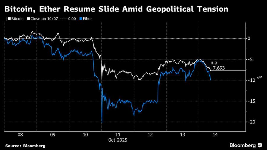 Bitcoin, aset digital terbesar berdasarkan kapitalisasi pasar, anjlok hingga 2,9% menjadi sekitar US$112.500 pada Selasa pagi di London, sementara Ether turun lebih dari 5% menjadi di atas US$4.000, menurut data yang dihimpun oleh Bloomberg.