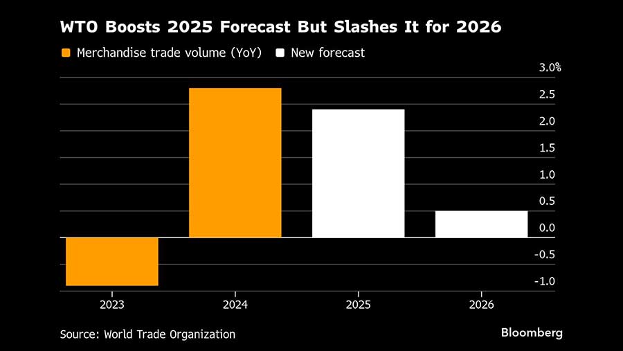 Pertumbuhan perdagangan barang global diperkirakan akan melambat secara signifikan tahun depan, mencerminkan dampak tertunda dari tarif Trump, kata Organisasi Perdagangan Dunia (WTO) pada 7 Oktober. Volume perdagangan barang diperkirakan hanya akan naik 0,5% pada 2026, dibandingkan dengan 2,4% tahun ini, menurut forum yang berbasis di Jenewa tersebut.