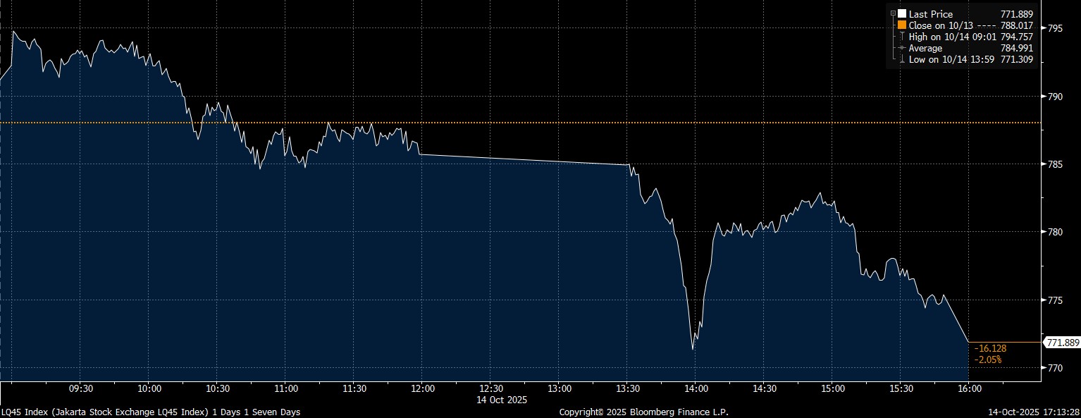 Hingga penutupan perdagangan, indeks LQ45 yang berisikan saham–saham Big Caps tercatat melemah mencapai 2,05% ke level 771,88.