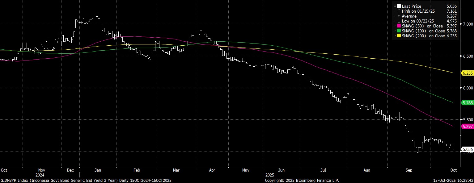 Pengelolaan Anggaran Pendapatan dan Belanja Negara (APBN) 2025 juga menjadi sentimen bagi pasar obligasi. Per September, belanja negara turun 0,8% dibandingkan sembilan bulan pertama 2024 menjadi Rp2.234,8 triliun.