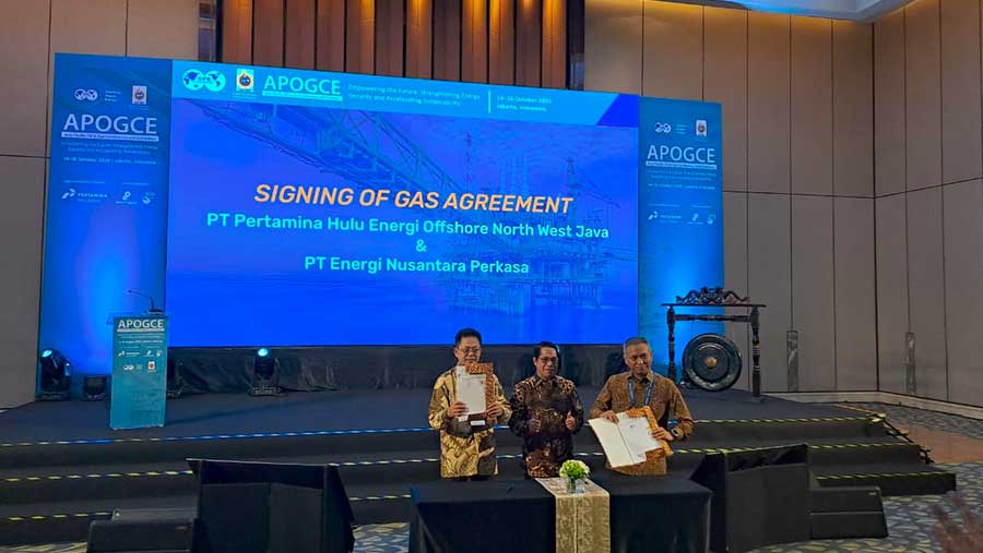 Bloomberg Technoz, Jakarta - PT Pertamina Hulu Energi Offshore North West Java (PHE ONWJ), anak usaha Subholding Upstream Pertamina di bawah pengawasan SKK Migas, resmi menandatangani Perjanjian Jual Beli Gas Terproses dengan PT Energi Nusantara Perkasa (ENP) pada ajang Asia Pacific Oil & Gas Conference and Exhibition (APOGCE) di Jakarta, Selasa (14/10).