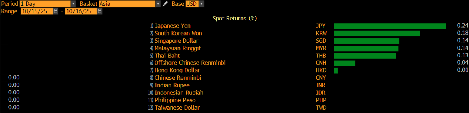 Di pasar regional pagi ini, Kamis (16/10/2025), reli penguatan valuta Asia berlanjut dipimpin oleh yen Jepang, diikuti oleh won Korsel, dolar Singapura, ringgit Malaysia, baht Thailand, yuan offshore, dan dolar Hong Kong.