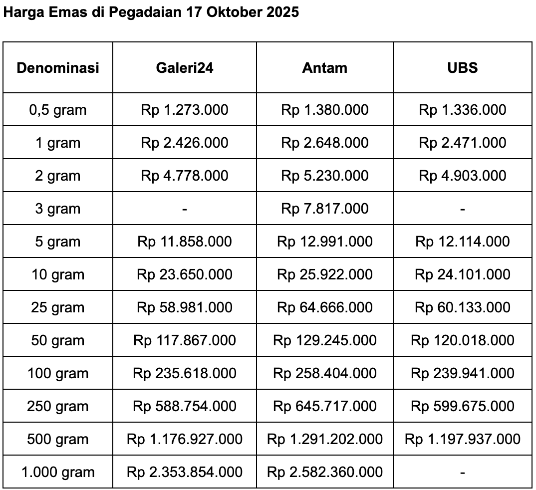 Adapun untuk ukuran 1 gram, harga emas Galeri 24 di Pegadaian adalah Rp 2.426.000. Dalam, sehari, terkerek Rp 21.000.