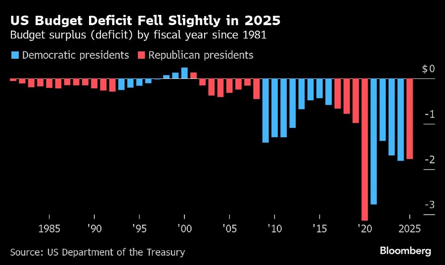 Bloomberg, Defisit anggaran AS sedikit menurun untuk tahun fiskal 2025 karena pendapatan tarif mencapai rekor tertinggi. Meskipun laju peminjaman tetap tinggi secara historis di tengah ekspansi ekonomi dan stabilitas keuangan.