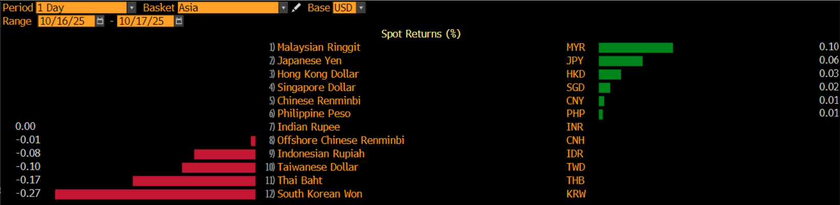 Sedang, ringgit Malaysia memimpin penguatan di Benua Kuning, bersama yen Jepang, dolar Hong Kong, dolar Singapura, yuan China, dan juga peso Filipina, yang berhasil menghijau.