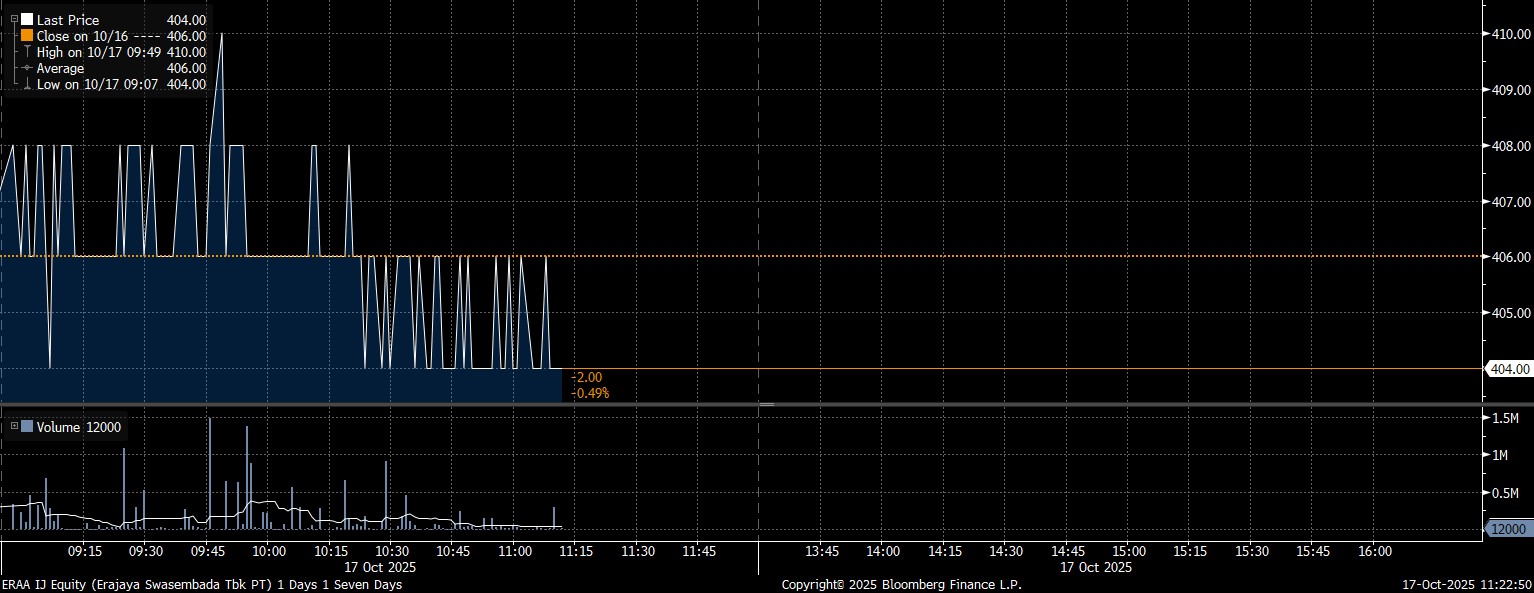Hingga pukul 11:00 WIB, saham ERAA menyerah hingga turun ke level saat ini, Rp404/saham.