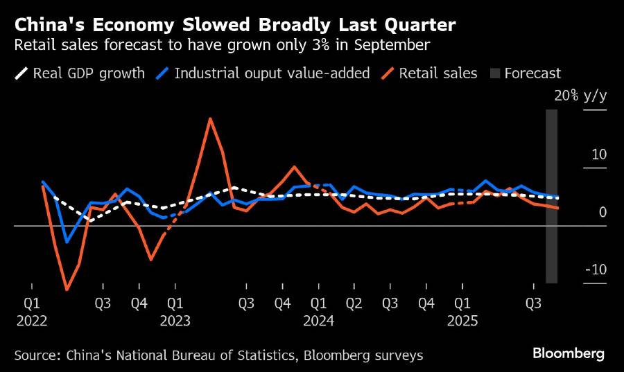 Penjualan ritel diperkirakan tumbuh 3% pada September dan produksi industri naik 5%—laju yang akan menjadi terlemah tahun ini untuk keduanya. Analis juga memprediksi investasi properti dan aset turun lebih lanjut.