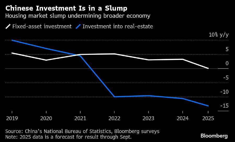 Dalam sembilan bulan pertama, investasi aset tetap diperkirakan melambat lagi dan tidak berubah dari tahun sebelumnya. Nilainya merosot sejak Mei meski ada ekspansi besar-besaran pinjaman pemerintah untuk mendukung daya beli pemerintah daerah.