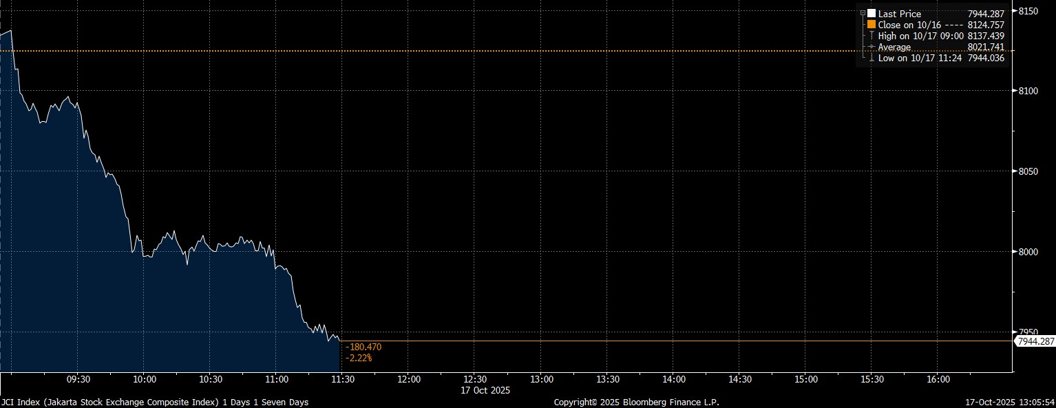 Bloomberg Technoz, Jakarta - Indeks Harga Saham Gabungan (IHSG) menutup perdagangan Sesi I di zona merah. IHSG melemah 180,46 poin atau ambles 2,22% ke level 7.944,28 pada Jumat (17/10/2025). Saham ADMR, saham MBMA, hingga saham UNVR jadi pemberat.