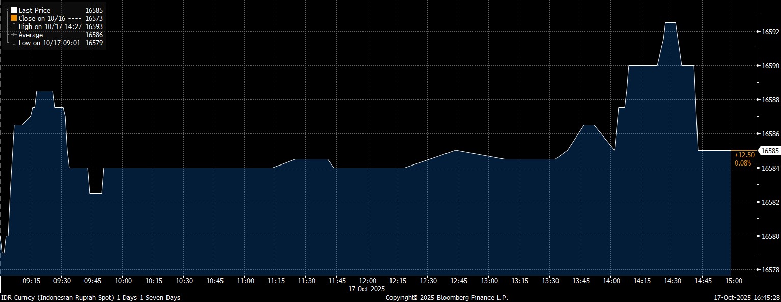 Rupiah spot ditutup melemah 0,08% di level Rp16.585/US$ seperti ditunjukkan data Bloomberg, Jumat (17/10/2025). Pelemahan rupiah terjadi bersama–sama dengan mata uang Asia lain.