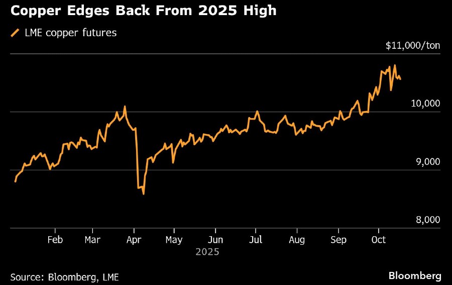 Tembaga di London Metal Exchange ditutup 0,4% lebih rendah di US$10.604,50 per ton pada pukul 5.50 sore waktu setempat, memangkas penurunan sebelumnya hingga 2%. Logam kabel tersebut menyentuh US$11.000 per ton pada pekan sebelumnya — level intraday tertinggi sejak Mei 2024 — akibat kekhawatiran pasokan.