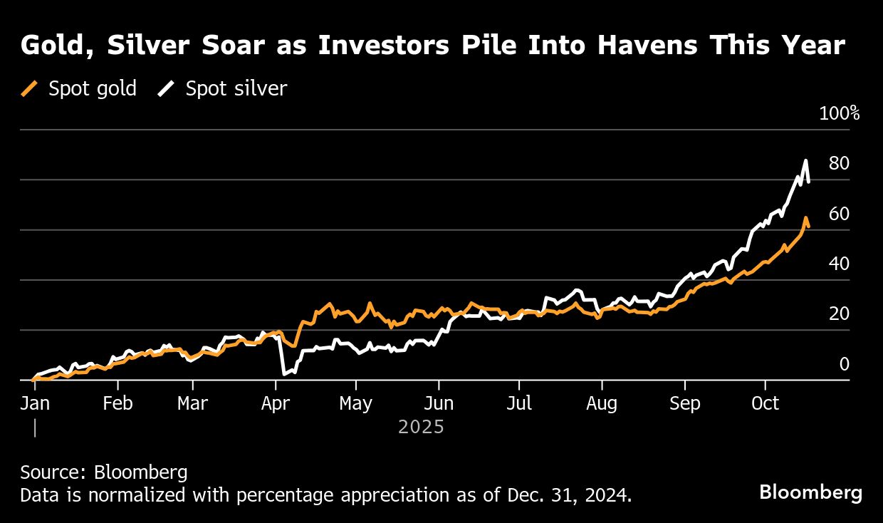 Harga perak turun lebih dari 6% pada Jumat — penurunan terbesar dalam enam bulan terakhir — setelah reli tajam sepanjang minggu yang mendorong harga ke rekor tertinggi baru, mendekati US$54,50 per ons. Meski demikian, harga emas masih mencatat kenaikan lebih dari 60% sepanjang tahun ini, didorong oleh pembelian besar-besaran dari bank sentral dan arus masuk ke dana investasi berbasis emas (ETF).