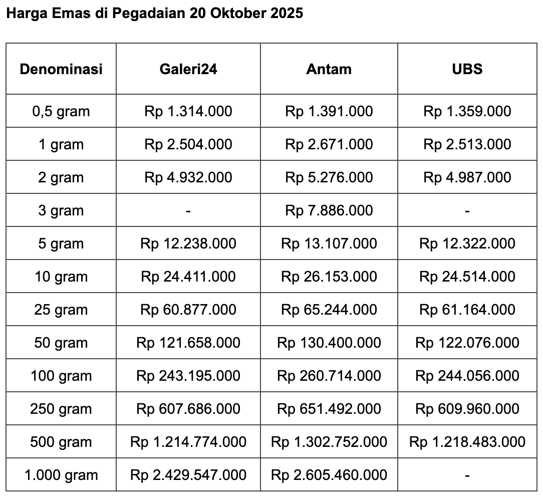 Pada Senin (20/10/2025), Pegadaian memasang harga emas batangan cetakan PT Aneka Tambang (Persero) Tbk (ANTM) untuk ukuran terkecil 0,5 gram di Rp 1.391.000. Sementara untuk ukuran 1 gram, harga emas Antam di Pegadaian adalah Rp 2.671.000.