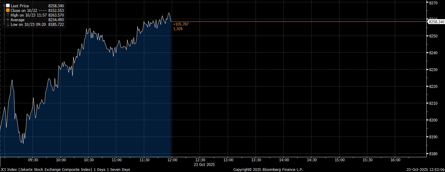 Bloomberg Technoz, Jakarta - Indeks Harga Saham Gabungan (IHSG) berhasil menutup perdagangan Sesi I di zona hijau dengan penguatan 1,3% di posisi 8.258 pada perdagangan Kamis (23/10/2025) didorong oleh saham Unilever (UNVR) dan saham Telkom Indonesia (TLKM) yang melesat.