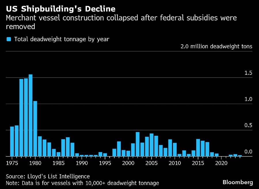 Kemunduran banyak industri AS terjadi setelah "China shock," di mana China bergabung dengan Organisasi Perdagangan Dunia pada 2001 dan dengan cepat menjadi pabrik dunia berkat manufaktur berbiaya rendah. Namun, industri pembuatan kapal komersial AS sudah lesu sebelum China memperkuat upaya maritimnya yang didukung negara.