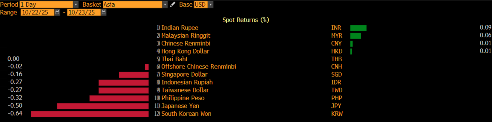 Imbasnya, mata uang Asia kompak melemah pada perdagangan hari ini. Won Korea Selatan, Yen Jepang, peso Filipina, dolar Taiwan, dolar Singapura, dan yuan offshore melemah masing-masing 0,64%, 0,5%, 0,32%, 0,27%, 0,16%, dan 0,02%. Pelemahan rupiah menjadi yang terdalam ke–lima di Asia.