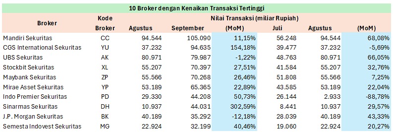 Banyaknya akumulasi yang dilakukan dengan fasilitas margin juga tercermin nilai transaksi sejumlah broker yang melonjak pada Agustus dan berlanjut hingga September (lihat tabel).