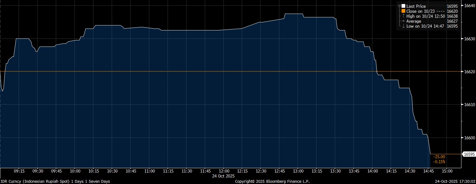 Pada Jumat (24/10/2025), US$ 1 sepadan dengan Rp 16.595 pada penutupan perdagangan pasar spot. Mata uang Nusantara menguat 0,15% dibanding penutupan perdagangan hari sebelumnya.