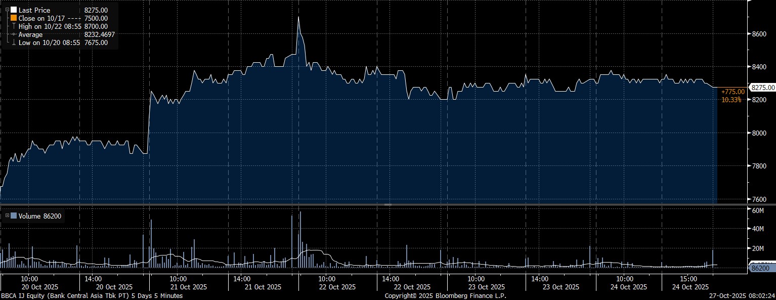 Adapun investor asing tercatat net buy saham terbanyak pada emiten PT Bank Central Asia Tbk (BBCA) mencapai Rp2,7 triliun. Sejalan dengan tren pembelian yang masif, saham BBCA menguat 10,33% dalam seminggu ke posisi Rp8.275/saham.
