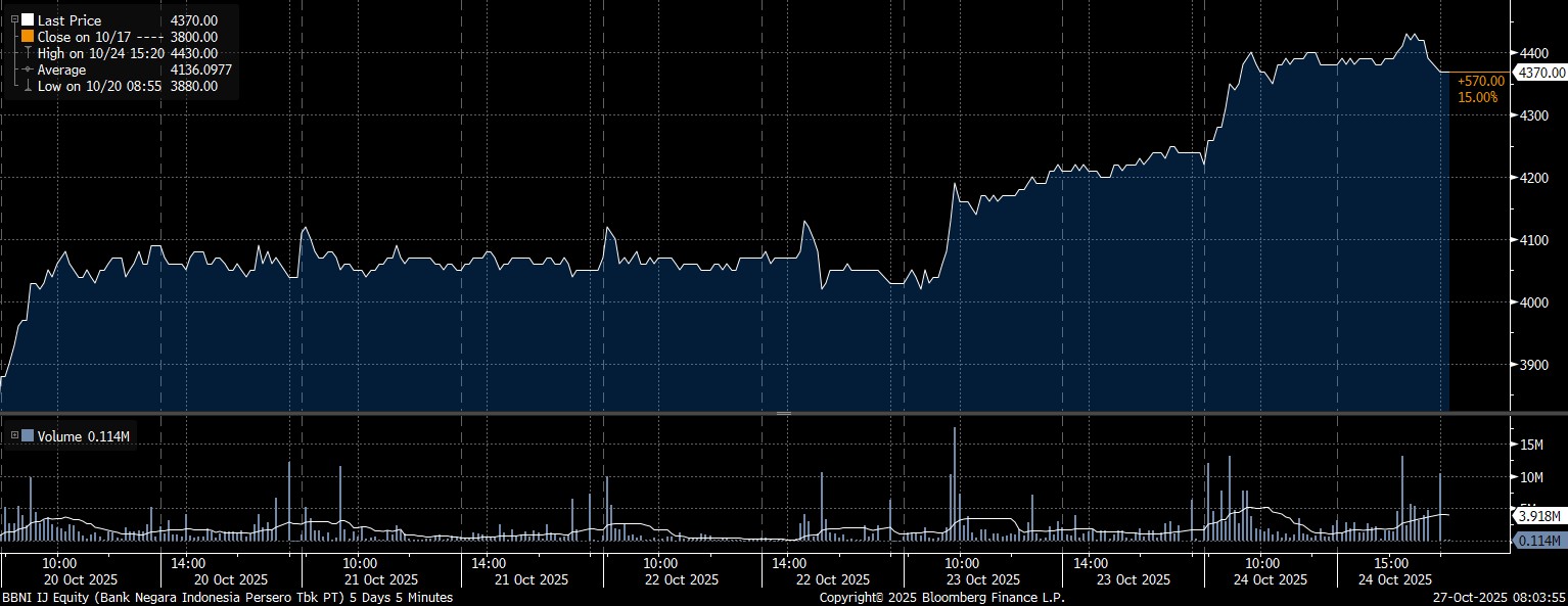 Pada kesempatan yang sama, investor asing mencatat net sell tertinggi pada saham PT Bank Negara Indonesia Tbk (BBNI) mencapai Rp216,08 miliar. Berseberangan jauh dengan tekanan jual, saham BBNI tetap berhasil menguat 15% mencapai posisi Rp4.370/saham.