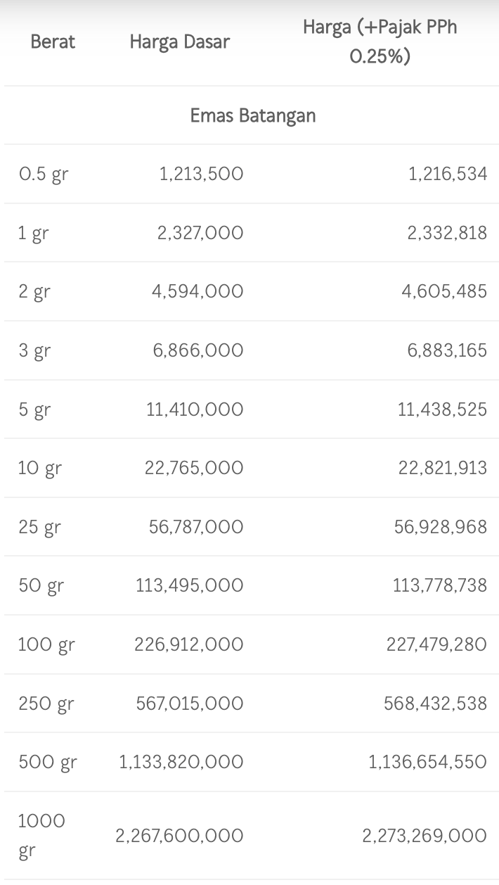 Berikut daftar lengkap harga emas Logam Mulia Antam untuk hari ini: