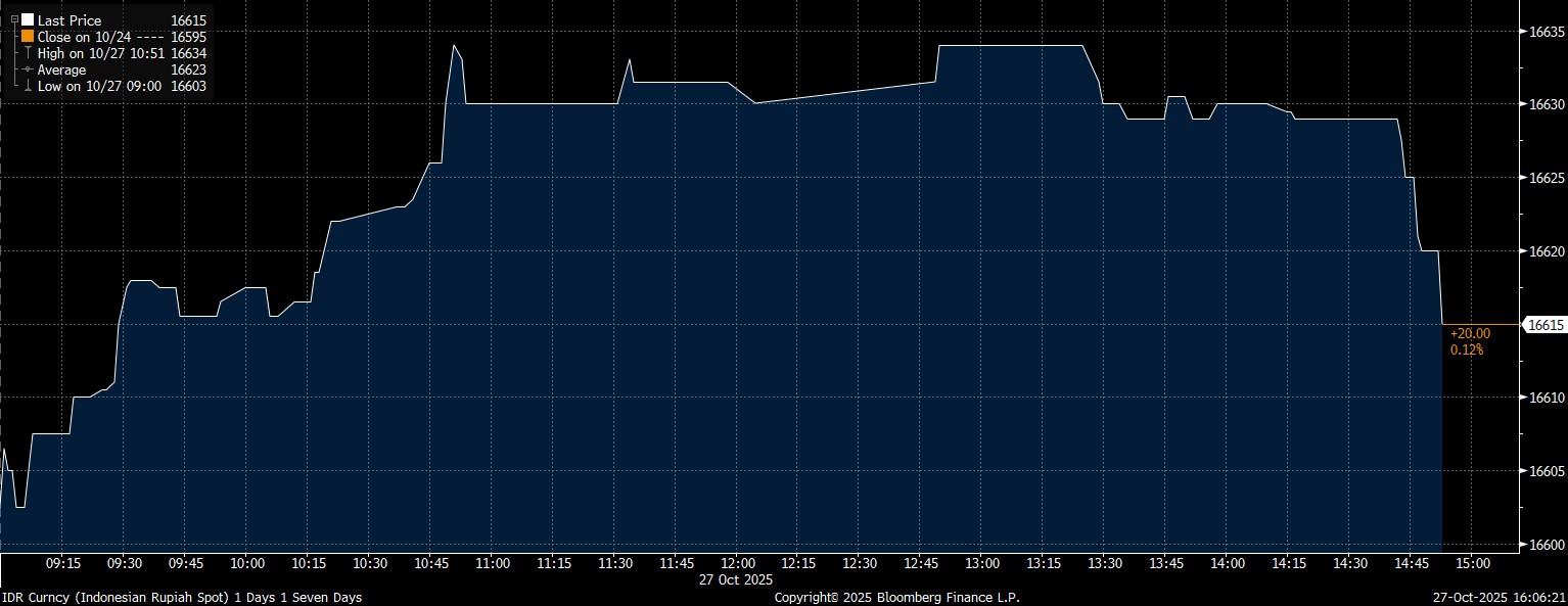 Mengacu data real time Bloomberg, rupiah ditutup melemah 0,12% di level Rp16.615/US$ dan menjadi mata uang Asia terlemah urutan ketiga hari ini, setelah rupee India yang melemah 0,42% dan peso Filipina 0,47%.
