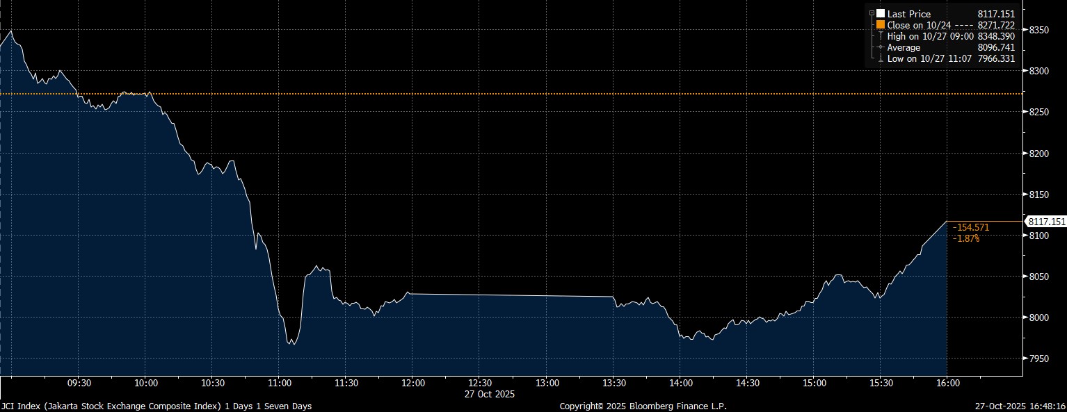 Bloomberg Technoz, Jakarta - Indeks Harga Saham Gabungan (IHSG) ditutup di zona merah, melemah 1,87% di 8.117 pada Senin (27/10/2025). Sejumlah saham LQ45 berikut ini justru berhasil melesat, saham Unilever Indonesia (UNVR) misalnya, melejit 7,11% yang tersengat sentimen laporan keuangan perusahaan.