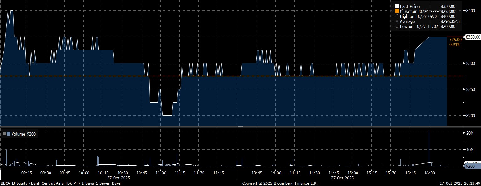 Adapun investor asing mencatat net buy pada saham PT Bank Central Asia Tbk (BBCA) mencapai Rp338,42 miliar. Terdorong manuver pembelian yang deras, saham BBCA menguat 0,91% dan ditutup di posisi Rp8.350/saham.
