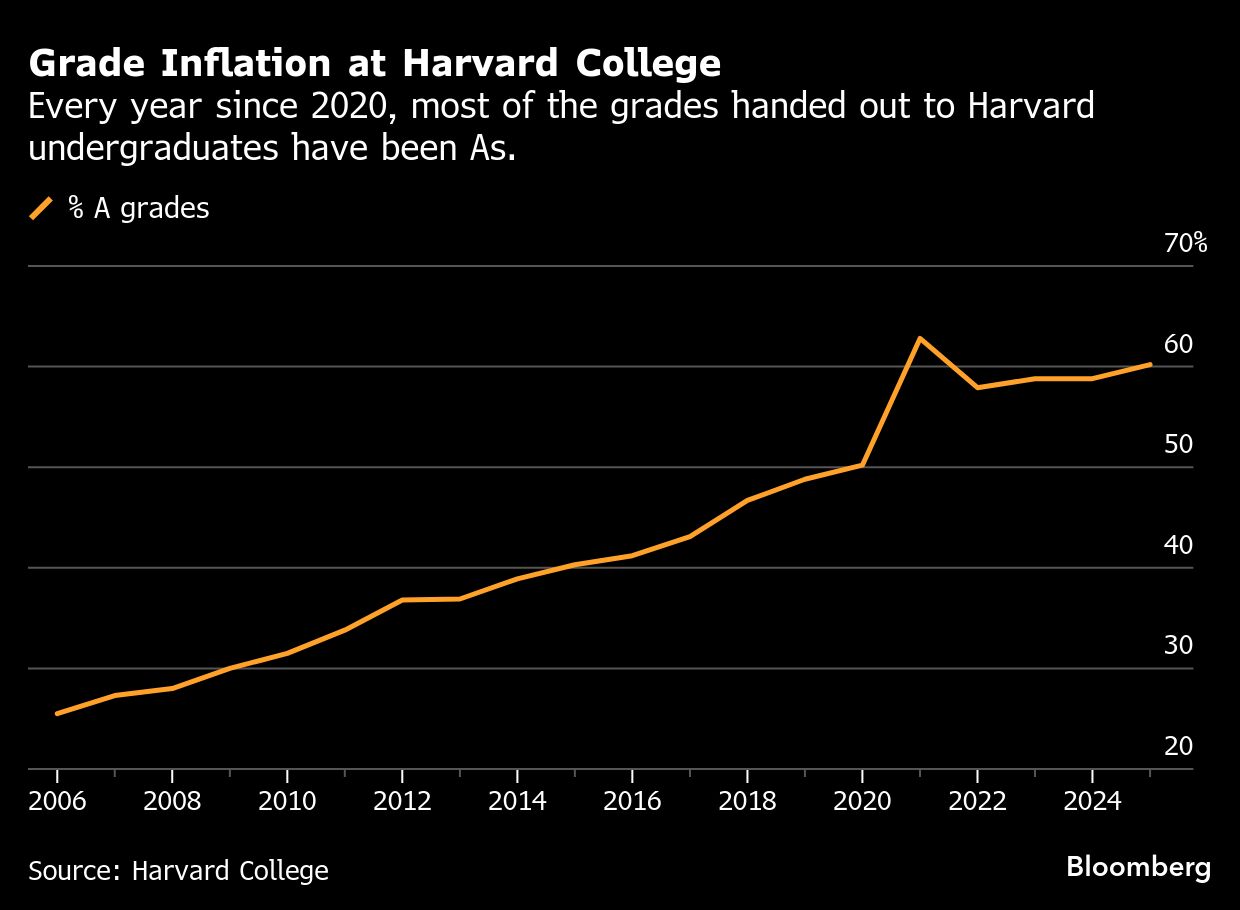 Bloomberg, Lebih dari setengah nilai yang diberikan di Harvard College adalah nilai A, meningkat dibandingkan beberapa dekade lalu meskipun para pejabat kampus selama bertahun-tahun telah memperingatkan tentang inflasi nilai yang meluas.